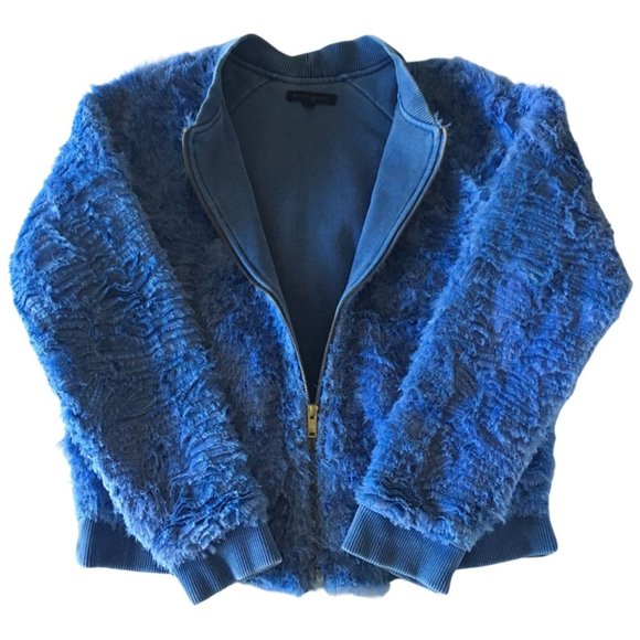 Turn heads in this vibrant blue faux-fur bomber jacket, a statement piece that blends cozy comfort with street-style edge. The soft, textured fabric, crafted from "eyelash yarn" gives a plush, tactile look while ribbed trim and a zip-front closure add a sporty finish. he jacket is thick, warm, and fully lined with a cozy 100% cotton sweatshirt-style fabric, combining comfort with bold style. Perfect for layering over tees, turtlenecks, or dresses.
