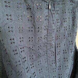 Very fitted size 6, mid thigh, navy eyelet dress. Back closure. Great for work and pairs well with a light off-white cardigan.