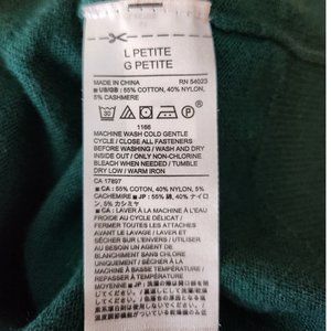 Banana Republic premium luxe yarn large petite green cardigan in good used condition with minor pilling under the arms. Cotton, nylon, cashmere blend.