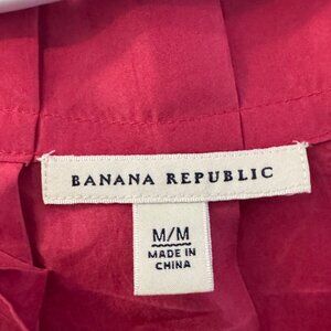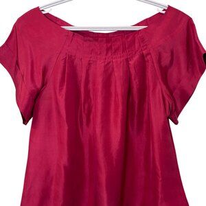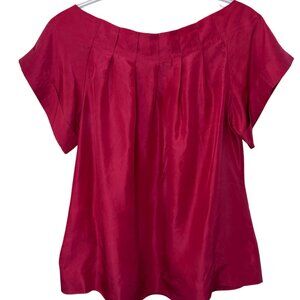 A Banana Republic blouse features a wide boat neck with delicate pleats across the front of the neckline. The sleeves are short, designed in a cap sleeve style, and appear slightly gathered at the shoulders. The fit through the body is relaxed and flowy, with pleating detail concentrated around the neckline.