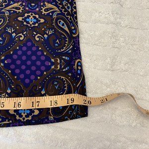 Purple/blue/tan paisley pattern on black background; gathering at the neck hard to capture in the photo; just for show - does not make the blouse stretchy at all