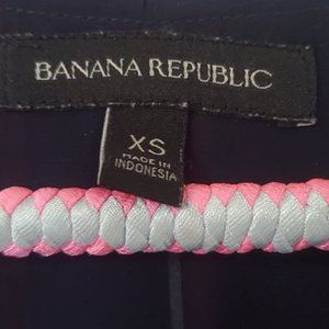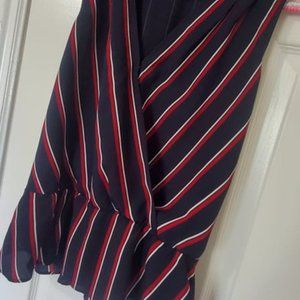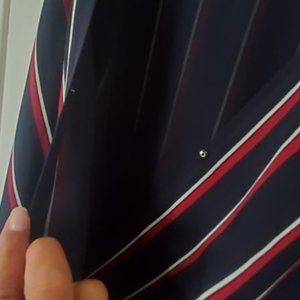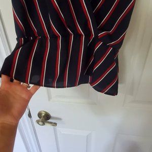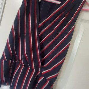 This banana republic tank top is very work appropriate or if you have a really nice lunch to go to with some clients or friends. Its stripped and has a button in the front to close it, so you will need to wear a tank top underneath of it. The bottom of it is pulled in so that the bottom flares out a little bit and has a slight ruffled effect.