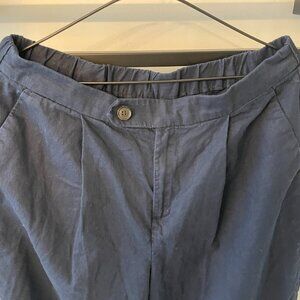 These are high-waisted, wide-leg navy trousers crafted from a lightweight linen and cotton fabric. Featuring front pleats and a single-button closure, they offer a relaxed yet tailored silhouette that’s perfect for both casual wear and polished, professional looks. There is some light pilling in the inner thigh area as seen in the last picture.