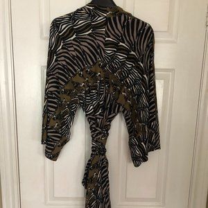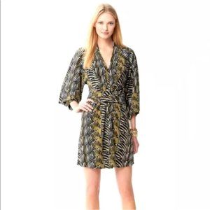 Banana Republic Collection with Issa London - Olive green zebra print dress size 10. Wrap dress with zip front. Three-quarter length kimono sleeves.