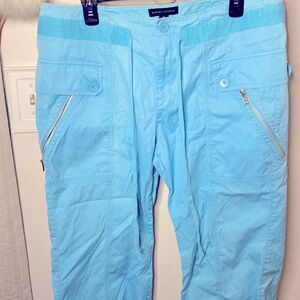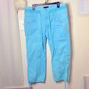 Beautiful aqua blue colour pants with silver zippers in great condition. Two front zippered pockets. Ties at ankles to wear as capris.