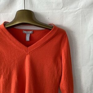 82% merino wool, nylon and spandex, orange, large but seems more medium/small, long sleeve, v neck, EUC, neck to hem 25”, armpit to armpit 18”, armpit to cuff 17”