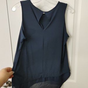 In good used condition. dressy office top in navy blue. sheer at bottom trim