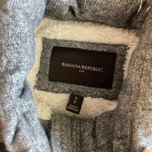 This cozy puffer vest by Banana Republic features a soft heather grey exterior with a detachable faux fur hood. Designed with a zip-up and snap closure, it also includes front pockets equipped with zippers for added functionality. Perfect for staying warm in winter or late fall, this piece combines comfort and style effortlessly.