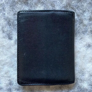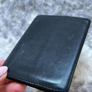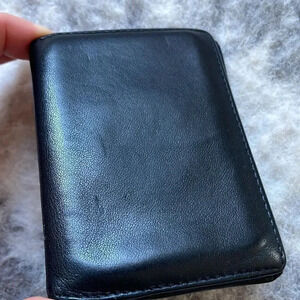 Small indentation in exterior leather as shown, and dust/debris and discolouration of ID see-through slot