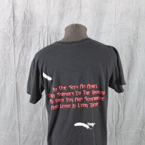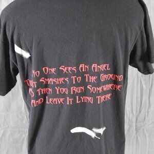 Up for sale is a retro band shirt. It has a black base colour with a graphic of the Dio album cover Holy Diver screened on the fornt. The back of the shirt has lyrics screened on in red. What a great shirt do not miss out on it.