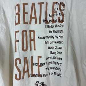 Introducing an amazing vintage Beatles For Sale T-shirt, perfect for any fan of the legendary band. This off-white shirt comes in size L with short sleeves, a crew neck, and features the iconic Beatles logo on both sides. Made of high-quality cotton and with a solid pattern, this shirt is perfect for any season and occasion.