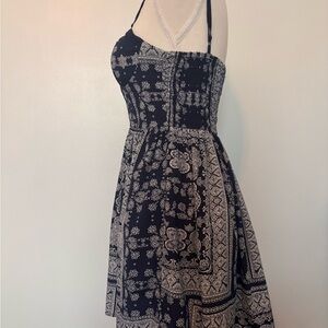 This elegant dress features a beautiful navy and white pattern, perfect for any occasion. The intricate design adds a touch of sophistication and fun to your summer wardrobe.