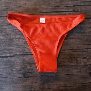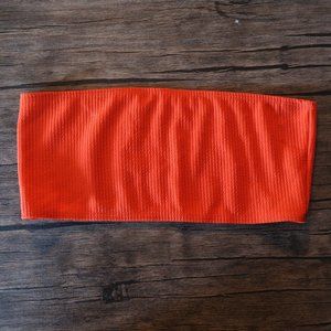 Orange/red bandeau bikini set. Both the top and bottoms are a size extra-small, but the material is stretchy and could easily fit someone who is a size small.