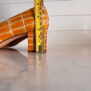 Step into elegance with these Bandolino heels, showcasing a vibrant orange hue and a unique geometric pattern. Crafted with a classic pump silhouette, these shoes feature a rounded toe and a comfortable heel height, perfect for adding a retro flair to any ensemble. The glossy finish enhances their mid-century modern aesthetic, making them a standout choice for any occasion. Excellent condition.