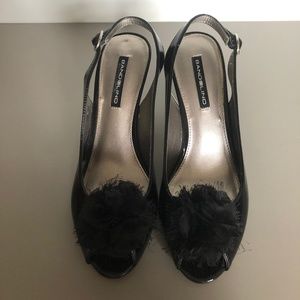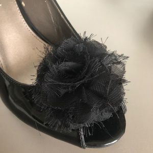 Black patent peep-toe sling-backs with 7.5 cm (3”) heels, and a fanciful feathered flower at toe. 7-1/2 medium. Never worn, very good condition. Any wear on the soles is from store try-ons.