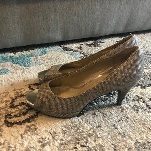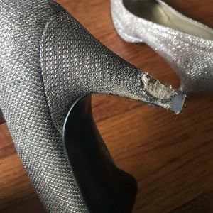 These were my wedding shoes and I loved them. Sparkly gold, comfortable, they were perfect. Very good condition. Would be excellent, but there is wear on the heels, shown in picture. I've worn them a couple times after the wedding, great for a night out, look awesome with jeans and dresses.