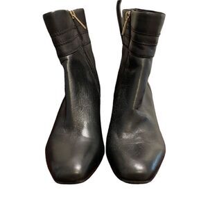 These Bandolino Black Heeled Booties in size 5.5 are in good pre-owned condition with minimal signs of wear. There is a small white mark near one of the zippers (please refer to photos), but other than that, they are in great shape. The upper is made from leather, while the balance is man-made, offering both durability and style.