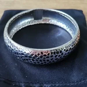 Silver bangle bracelet with spotted animal like print. Very lightweight. Not sterling, costume only. Very cute. width 3/4"