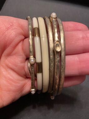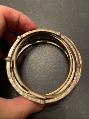 Set of six vintage bangles. See photos for condition. Not sure what metal they are made of butt they are sturdy and heavy.