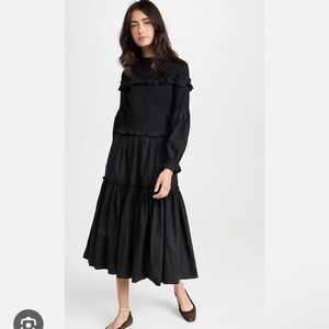 Ruffled mock neck featuring long sleeves with ruffle details and smocked cuffs, keyhole back button closure and ruffle details