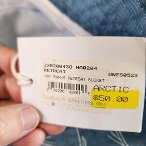 Stylish blue bucket hat with white palm tree design. Perfect for sunny days. Brand new with tags