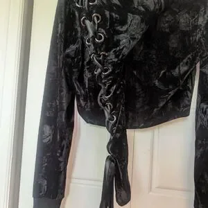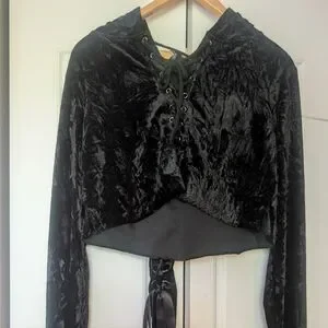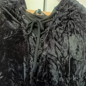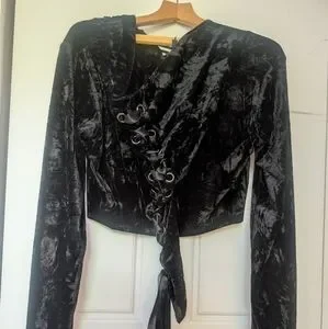 Elevate your style with this chic black velvet lace-up top. Perfect for any occasion, this top combines comfort and elegance.