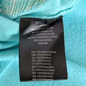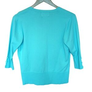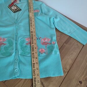 Teal button up Cardigan sweater with embroidered pink flamingos and 3/4 sleeves.