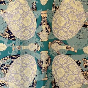 Elevate your outfit with this luxurious square silk scarf by Baoshidi, featuring a mesmerizing symmetrical print of teapots, florals, and ornate medallions. The colour palette of soft teal, lavender, and navy is elegant and serene, making it a versatile piece for all seasons. Crafted from smooth, lightweight silk, it’s ideal for wearing around the neck, in your hair, or tied to a bag. Baoshidi is known for blending artistic Eastern aesthetics with high-quality silk craftsmanship. 🇨🇳