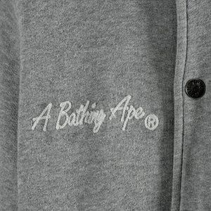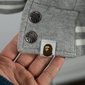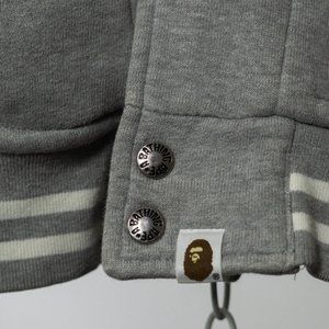 A flawless 2006 Bape bomber jacket in size S showcases iconic streetwear style. Made from sketchy fabric with a tall fit, it features side entry pockets, snap fastening, and elastic cuffs and collar. The distinctive Bape head patchwork and logo letters add a unique touch, making it a sought-after collectible in perfect condition.