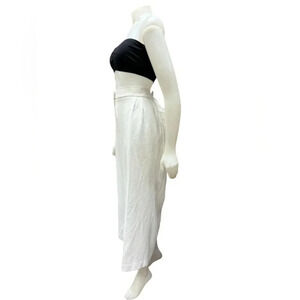Cropped high rise pants white pleated pockets zipper button and clasp closure elastic waist side for a more comfortable fit wide leg no extra stretch available