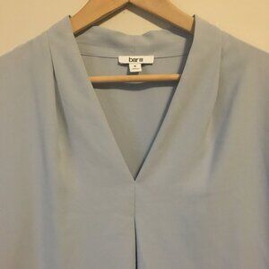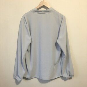 Very good preowned condition, light lavender purple/grey/silver poet sleeve blouse by Bar III featuring a single pleat down the center and a subtle pleat on either side of the front collar. Sleeves are full and elasticized at the cuffs. A dreamy fantasy look.