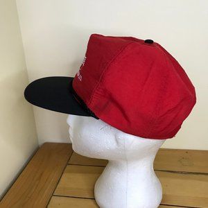Vintage red nylon trucker cap with black brim, has embroidered Bar-De Transportation Ltd logo on the front. Black cord runs across brim. Adult size has adjustable snapback. Good vintage condition, appears unworn.