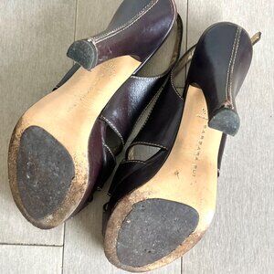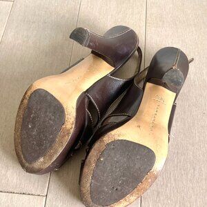 ⋆ Deep dark brown leather high-heel open-toe pumps w/ an adjustable golden square buckle. Sole is lined in metallic golden leather w/ white contrast stitching. Similar closed-toe version of this shoe available for sale.