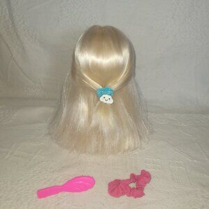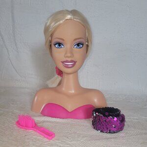 Barbie is requesting to book an appointment in your salon! She is preloved and doesn't come with original hair accessories but she does have a pink scrunchie and blue shiny knotted elastic with fun cute cloud charm. She also has a pink vintage Barbie brush, and a flippable sequin snap bracelet, or necklace for her! She may have minor surface wear, but overall she is in very good condition with soft and silky hair, tied back as shown to keep from tangling while on her journey to your home salon! Small parts, age 3+ unless you remove all accessories. She would be fun for play or display! I am not exactly sure when she was produced, but her head is marked 2005. Priced for condition.