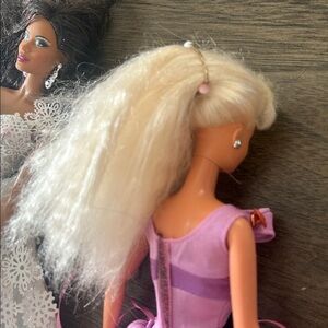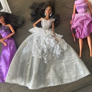 Barbie Collection! 2 with soft rubber legs. Silver Dress Barbie is from the Look Collection and has tilted hips and bent knee. Unique purple dress that has tassels on the side that shorten the dress. All unique!