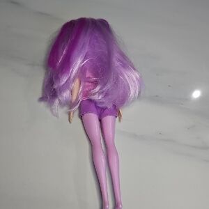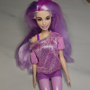 Barbie doll with long purple hair. Dressed in a sparkly purple top and shorts. Perfect for imaginative play.