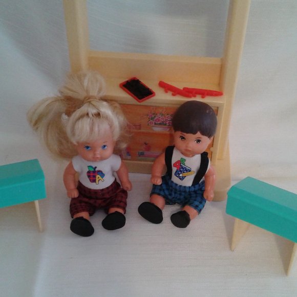 Comes with boy and girl student,2 desks, 2 pencils, chalkboard eraser and chalkboard with working sound effects (3 new AA batteries included)