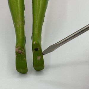 GUC – Paint flaking on feet & legs. Hair has been washed with shampoo and has a light scent. While testing the doll’s limb movement, I noticed two small black dots located underneath her buttocks in the joint area. These marks are hidden and not visible unless closely inspected.