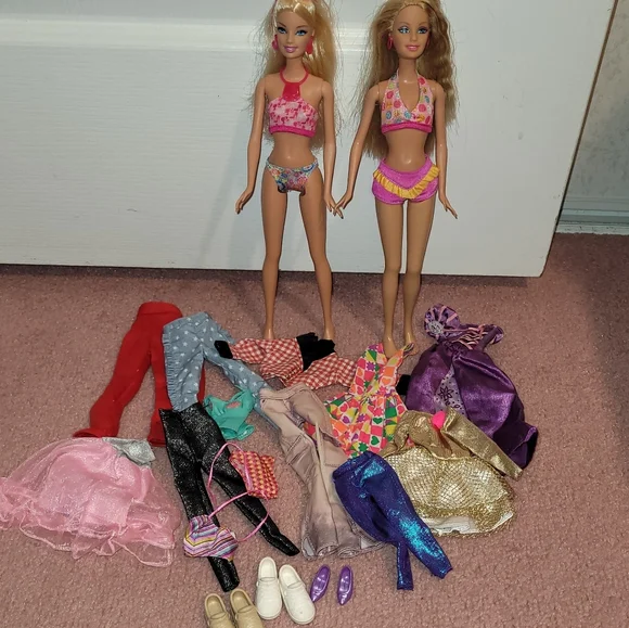 Two Barbie Dolls and a bag of clothes. Please note that some doll clothes may have signs of wear and tear such as rips or stains.