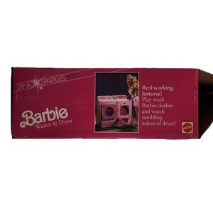 Vintage/Retro Barbie PInk Sparkles Washer & Dryer Set CIB. Mattel. 1990. Excellent Preloved condition. Truly Amazing colour & Condition on this one, no oranging at all from time due to being in box most of its life. No noticed cracks, however the bubble fluid escaped its confinement and found its way to the battery bay, I took it apart, fixed and cleaned it to my best standards. I make no guarantee of its continued working order as a result. Also the bubbles are not present anymore! Has Manual & empty sticker cards. All pieces present and accounted for. Was tested and working as of August 2025, please see videos. Has been washed and sanitized to the best of my ability. Will do a bundle deal on the barbie furniture & accessories once all is uploaded in whole or in part. Please see my coming soon posting for an idea whats upcoming from barbie.