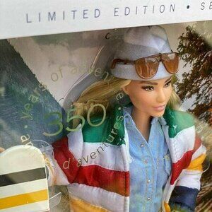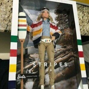 HBC Stripes Barbie doll is exploring the glorious Canadian Rocky Mountains and surrounding her are the beautiful sights and sounds of the vast landscape. From humble beginnings as an outpost beyond the mapped world to a leading international retailer, HBC is 350 years old, making it the oldest company in North America. Barbie pays homage to the company's original adventurers and the astonishing Canadian wilderness that continues to present staggering challenges and endless wonder. Embracing the time honoured Hudson's Bay Multi-Stripe Point Blanket, Barbie is proudly sporting a versatile puffer jacket, belt bag, matching hiking boots and paddle bearing the iconic stripes. She is ready to embark upon a journey of discovery, seizing all of life's adventures no matter how big or small. No more than 20,000 worldwide!