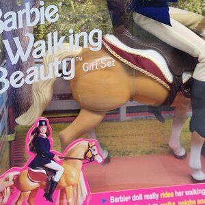 Rare 1998 Barbie & Walking Beauty Horse Gift Set by Mattel. The set includes a beautiful equestrian Barbie doll dressed in a riding outfit and her horse Walking Beauty, which walks, neighs, and blows kisses when activated.