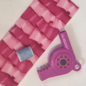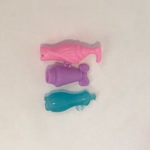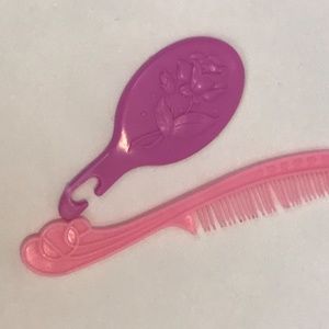 The is a pink ruffled Barbie towel, a pink hairdryer, and a roll of toilet paper. There are three bottles of soap (pink, purple and blue) and a pink rose mirror and light pink comb.