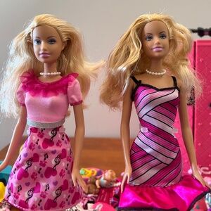 Two barbie dolls with closet, clothes and accessories. Both dolls have glue seepage issues. Clothes may have stains and imperfections. Stands not included. Comes from smoke free, pet friendly home. Closet is not barbie branded.