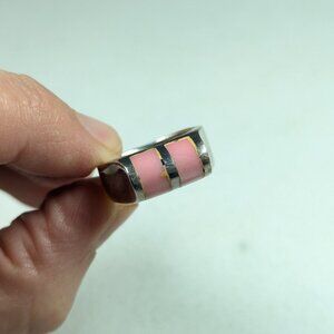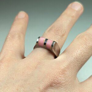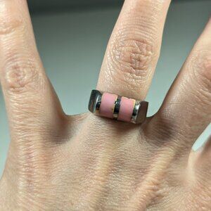 A chunky silver toned ring with pink accents to the rounded top. There seems to be a small mark but I can´t make it out. With some discolored lines around the inset pink stones. Roughly ring size 7 3/4 or P
