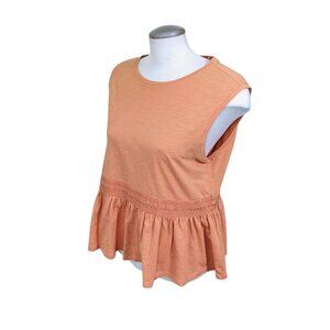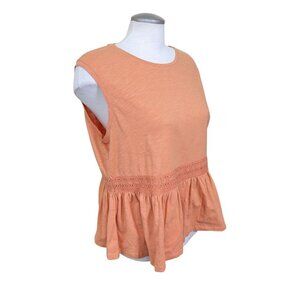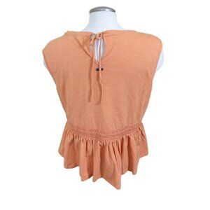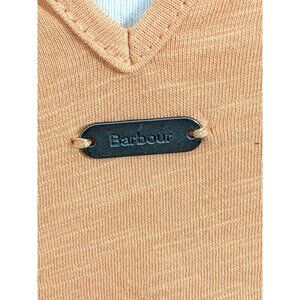 Embrace a touch of effortless chic with the Barbour Willow Women's Peplum Cotton Top. This peachy pastel orange tank in size L offers a classic fit that flatters the silhouette, making it a versatile addition to your wardrobe. The pullover design ensures ease of wear, perfect for those days when simplicity is key. The top features delicate crochet lace trim, adding a feminine and bohemian vibe to the basic style. Crafted from soft, breathable cotton, it's a comfortable choice for various casual occasions. Whether styled for a relaxed summer outing or a fall get-together, this sleeveless piece is a harmonious blend of minimalist elegance and playful femininity. Neck label is cut out. No size indication. Measures like a womens large. Measurements (approximate, laid flat, one side, double to go all way around where applicable) Chest (underarm to underarm):22 in Length (collar seam at the back to hem):24 in