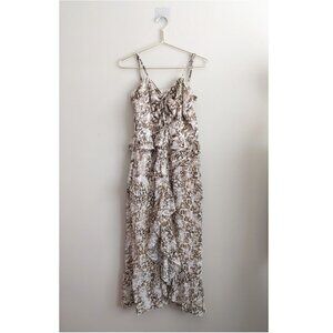 Stylish Bardot midi dress with animal print. Features ruffled details and spaghetti straps. Perfect for a chic look.