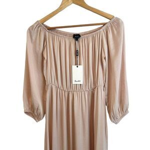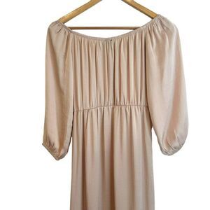 In excellent condition. Bardot Ithaca maxi dress. In a gorgeous champagne colour "proecco", this is a perfect wedding guest dress. Scooped, elastic neckline with 3/4 elastic cuff sleeves. Defined elastic waist with belt loops but this dress is missing the fabric tie. Long, maxi length wit slits on either side for easy, flowy movement. Flat lay measurements: 15" pit to pit, 48" length
