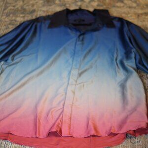 Shirt is made of a lightweight and floaty satin, has a placket over the buttons for a more sleek appearance and has long sleeves with button cuffs.