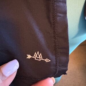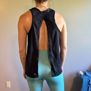 This Bare Activewear black tie tank is sweat wicking and fast drying. 80% nylon, 20% spandex. Lots of stretch. Tank can be worn/tied in many different ways. Fits like a M.